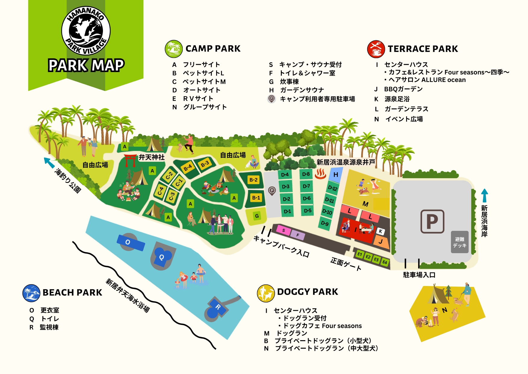 オート、フリー、ペット、RV、グループの5つのエリアからお好きなキャンプスタイルで満喫いただけます。