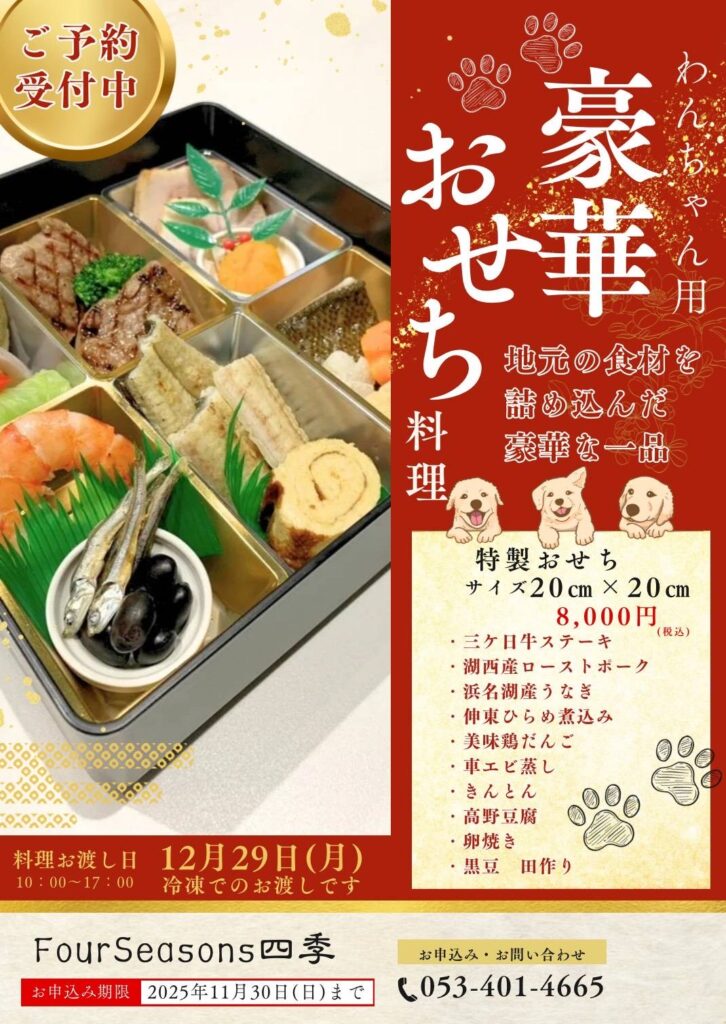 【限定15セット】わんちゃん用豪華おせち受付開始 2025 10/09 お知らせ ご予約は11月30日(日)までにお願いします。 このフォームに入力するには、ブラウザーで JavaScript を有効にしてください。このフォームに入力するには、ブラウザーで JavaScript を有効にしてください。お名前 お名前 個数をご記入ください 電話番号 電話番号 *個数をご記入ください *お受け取り予定の日時をご記入ください *12月29日(月)10時~17時その他ご要望などございましたらご記入ください送信 ご予約を確認次第、担当者より詳細メールをお送りいたします。 053-401-4665 お知らせ よかったらシェアしてね! URLをコピーしました! URLをコピーしました! 関連記事 わんちゃん仮装コンテスト出場犬募集 2025-10-09 10/19(日)開催 浜名湖パークビレッジ収穫祭 2025-10-05 11/8(金)初心者向けキャンプ体験 2024-10-03 静岡第一TV「まるごと/突撃インディアンス」にて紹介していただきました 2024-07-29 7/6 満員御礼 2024-06-27 7/20(土)わん祭りin浜名湖パークビレッジ開催 2024-06-10 浜名湖パークビレッジグランドオープン 2024-03-09 オープニングスタッフ募集! 2024-02-08