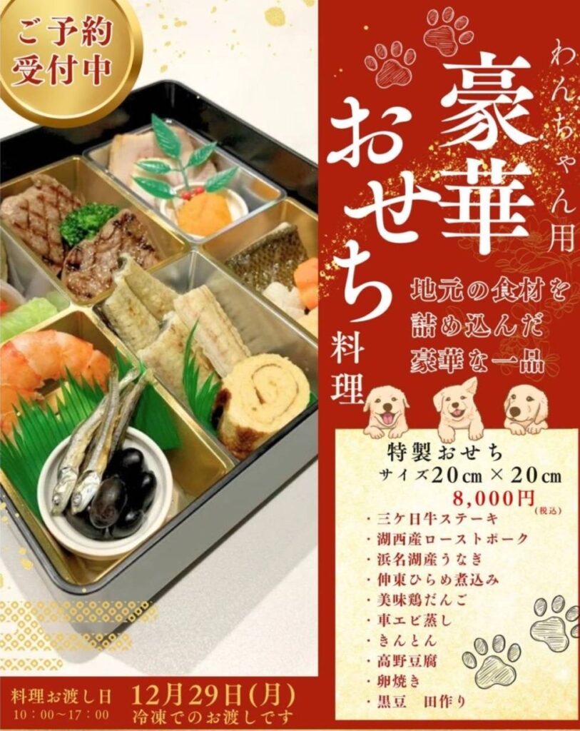 【限定15セット】わんちゃん用豪華おせち受付開始 2025 10/09 お知らせ ご予約は12月10日(水)までにお願いします。 このフォームに入力するには、ブラウザーで JavaScript を有効にしてください。このフォームに入力するには、ブラウザーで JavaScript を有効にしてください。 その他ご要望などございましたらご記入ください 個数をご記入ください お名前 お名前電話番号 *メールアドレス *メールアドレスメールアドレスを確認個数をご記入ください *お受け取り予定の日時をご記入ください *12月29日(月)10時~17時その他ご要望などございましたらご記入ください送信 ご予約を確認次第、担当者より詳細メールをお送りいたします。 053-401-4665 お知らせ よかったらシェアしてね! URLをコピーしました! URLをコピーしました! 関連記事 12/7(日)わん祭り~年末感謝祭~ 2025-11-08 ハロウィンウィーク 2025-10-24 わんちゃん仮装コンテスト出場犬募集 2025-10-09 11/8(金)初心者向けキャンプ体験 2024-10-03 静岡第一TV「まるごと/突撃インディアンス」にて紹介していただきました 2024-07-29 7/6 満員御礼 2024-06-27 7/20(土)わん祭りin浜名湖パークビレッジ開催 2024-06-10 浜名湖パークビレッジグランドオープン 2024-03-09