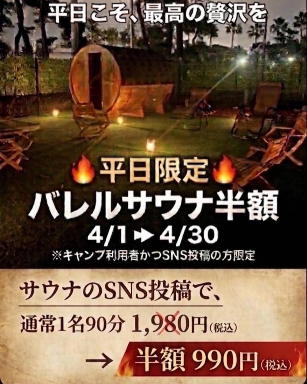 【4月限定】キャンプ利用&SNS投稿でバレルサウナが半額!